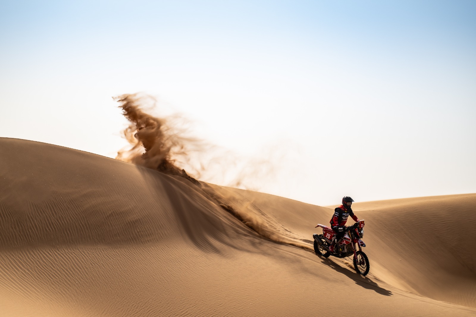 A Honda off-road motorcycle rider in red gear navigates sand dunes in a desert landscape. The bike's headlight is on, and the rider is leaning forward, suggesting movement across the challenging terrain.
