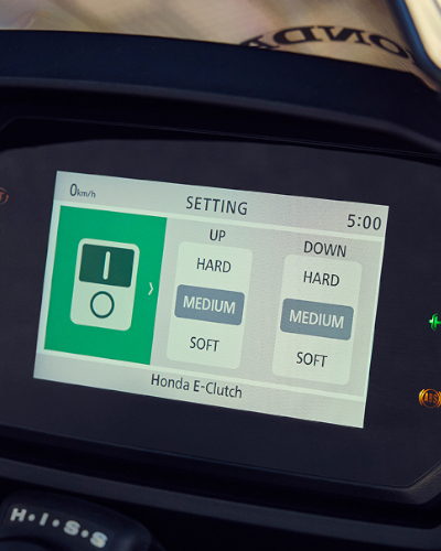 L'embrayage E-Clutch, une exclusivité Honda, fait passer la conduite à un autre niveau de plaisir. Choisissez le contrôle manuel de l'embrayage de la boîte à six rapports ou activez l'embrayage électronique E-Clutch à partir de l'écran TFT et oubliez le levier d'embrayage. ni plus ni moins. Que ce soit pour démarrer, changer de rapport ou s'arrêter, il suffit d'utiliser le sélecteur : le E-Clutch s'occupe du reste, instantanément et en douceur. Vous ne pouvez pas caler. La circulation est plus facile. Et si vous voulez utiliser l'embrayage ? Allez-y.